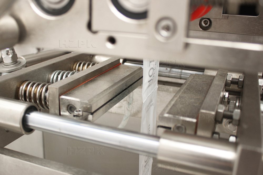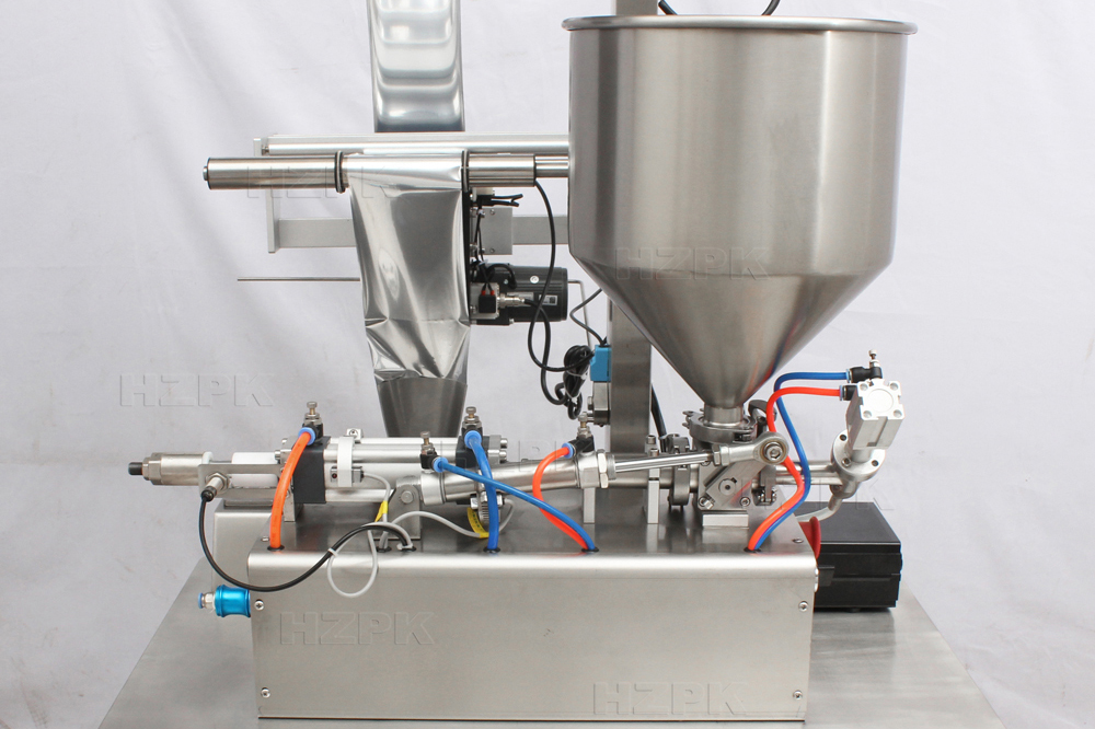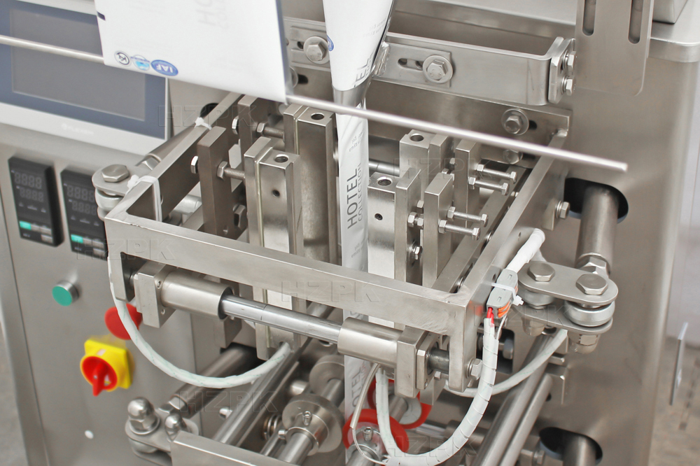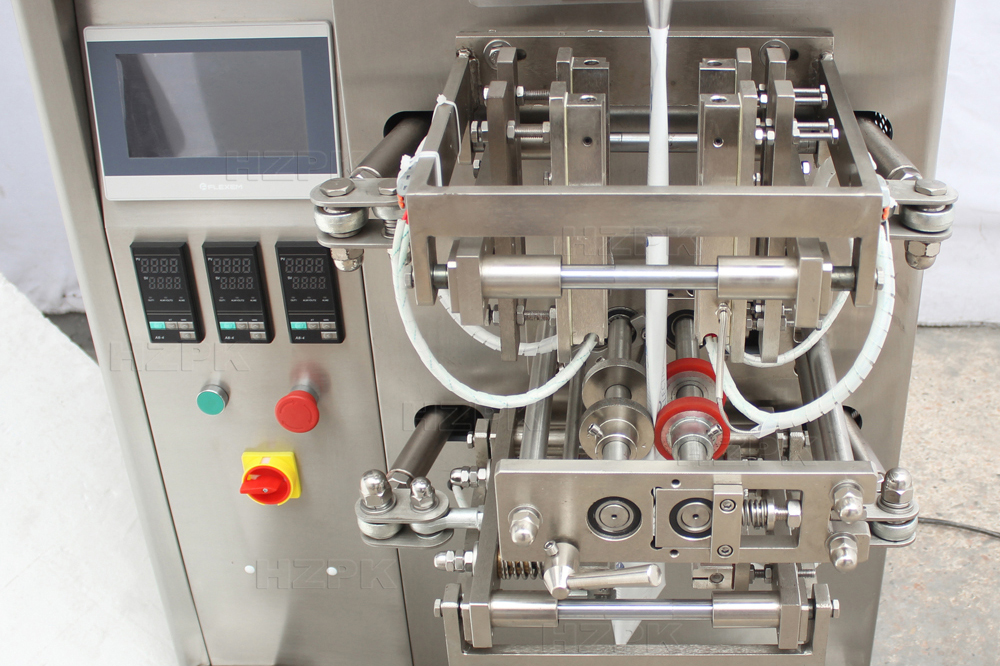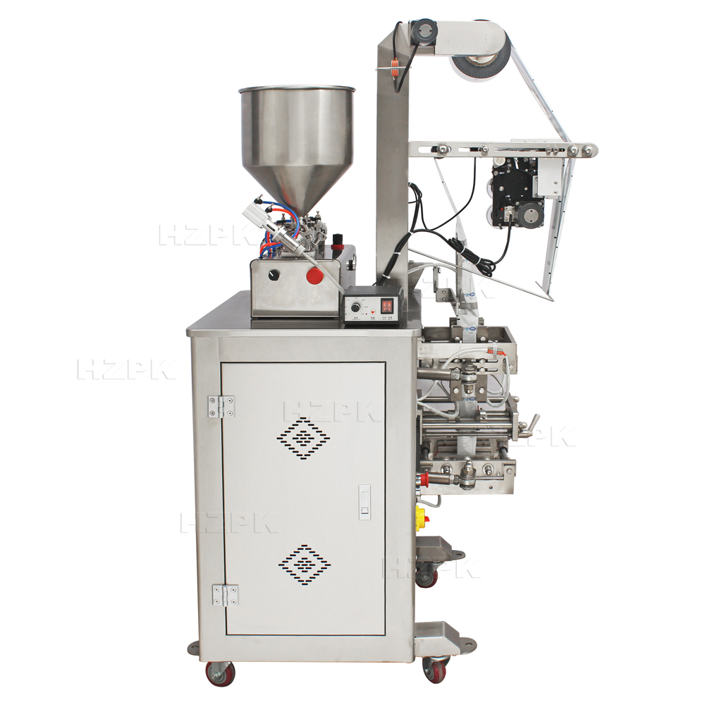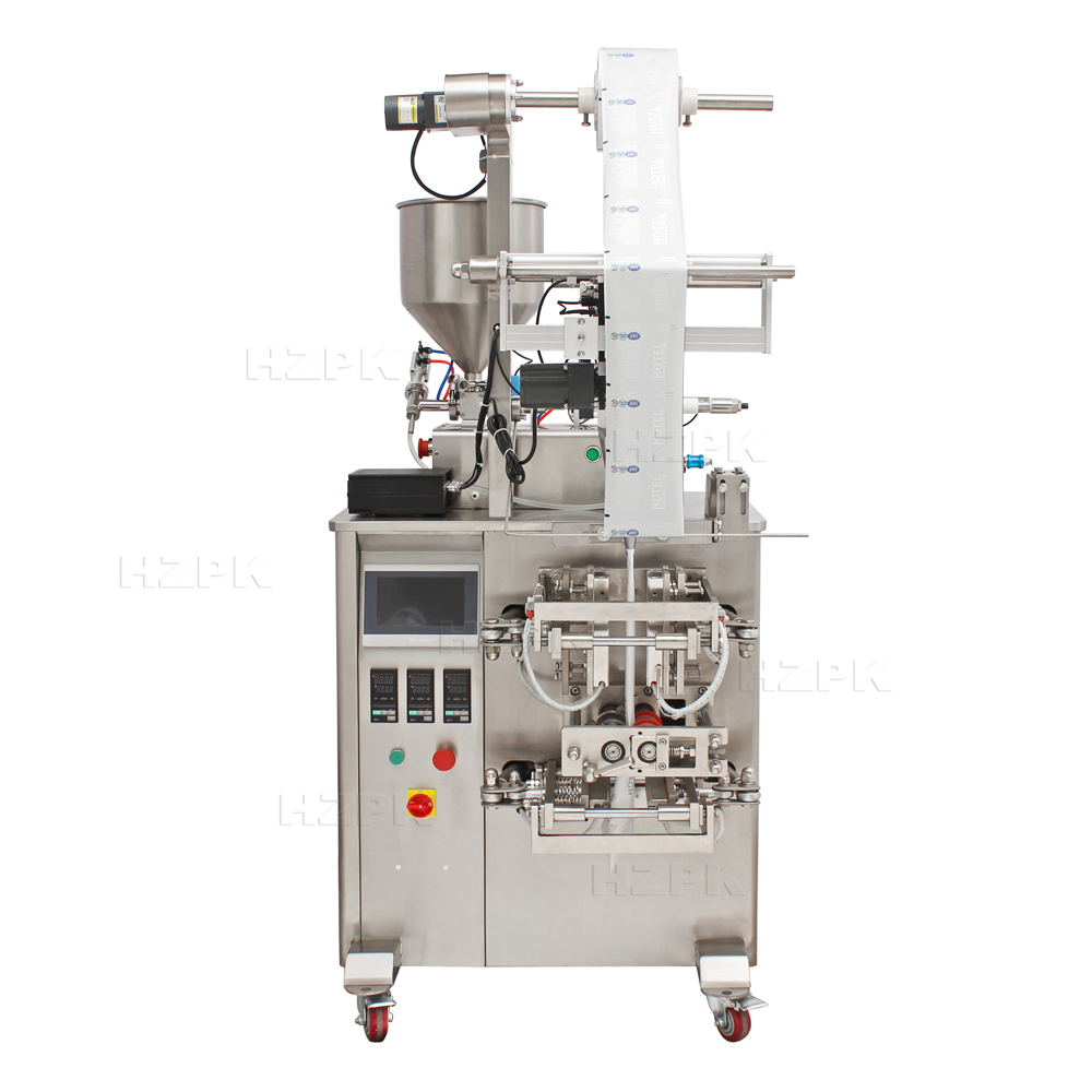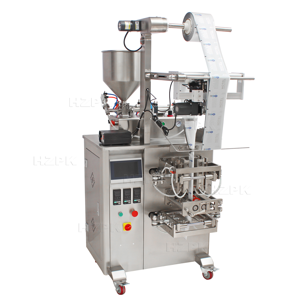 This automatic form-fill-seal machine packages various pastes and liquids (e.g., shampoo, ketchup, sauce). It performs bag making, filling, sealing, and counting, with an integrated coder for date/batch printing. Bags can be produced as continuous strips or individually separated.