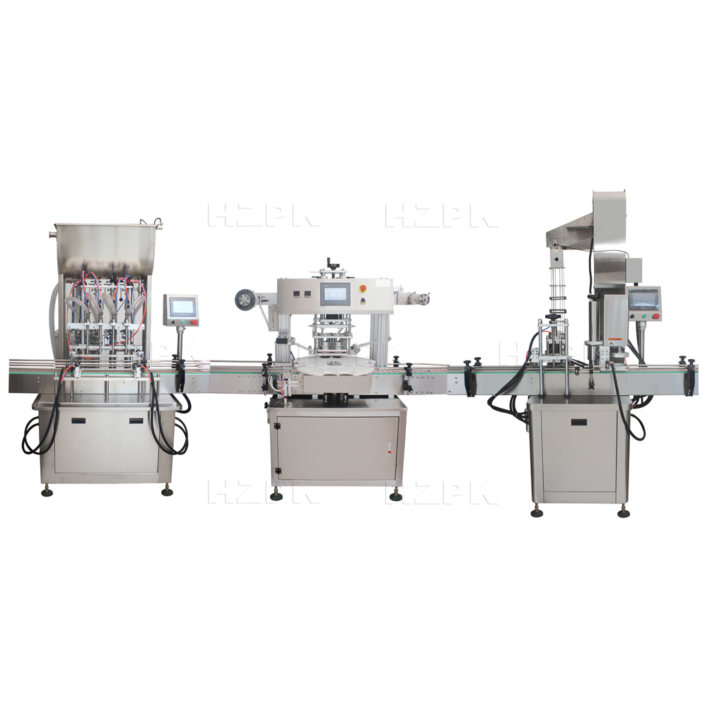 This fully automated production line is designed for efficiently filling and packaging liquid and cream-based products such as facial creams and hair masks. It includes a 4-head automatic filling machine, a rotary sealing machine, an automatic cap placement unit, and a capping machine—specialized for use with wide-mouth jars.