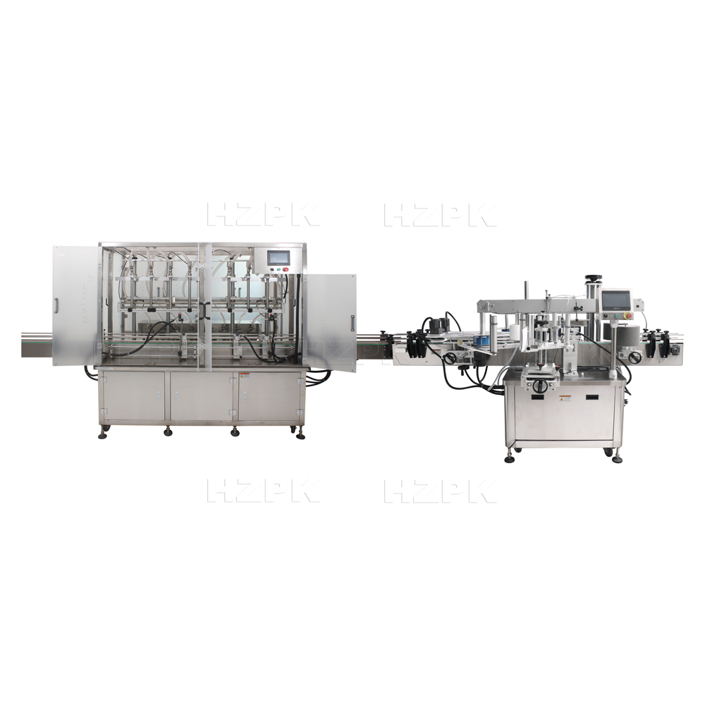 This cutting edge production line, featuring an 8 head gear pump filling machine and an automatic double sided labeling machine. The gear pump filling machine boasts 8 adjustable nozzles with anti drip functionality, ensuring precise and efficient filling. The contact parts are made of 304 stainless steel and food grade plant plastic, ensuring compliance with the highest hygiene standards. Complementing this, our flat double sided labeling machine is designed for high precision. Its triple pressing mechanism guarantees a smooth and wrinkle free application of labels. This production line is tailored for various large capacity bottle packaging needs.