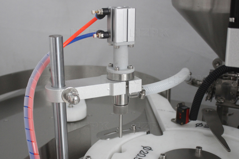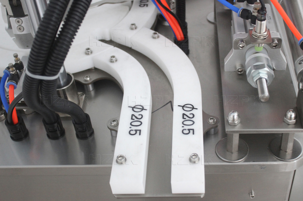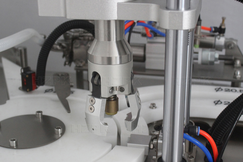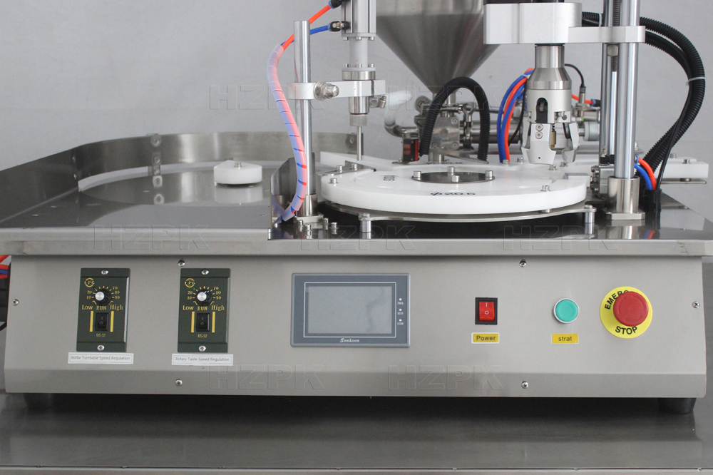 This automatic filling and capping machine is mainly used for filling fluid into small bottles, such as drop a bottle, spray bottle, dome bottle and so on. It adopts piston type filling machine, which is suitable for filling various pastes and liquids.Automatic multi station turntable system, bottle feeding, filling, capping and ejecting the bottle. Touchscreen panel and plc control system, easy to operate, can be customized in multiple languages. Server motor driving technology, which is stable and high accuracy. Machine body is made of high quality stainless steel.